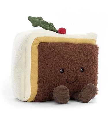 When you’re full of food and feeling snoozy, snuggle Amuseable Slice of Christmas Cake! Chunky-cheery, this fluffy brown cake has suedey layers of marzipan and icing. With a dapper green and red holly quiff, bobbly boots and a friendly grin, this squashy slice is full of sweetness.