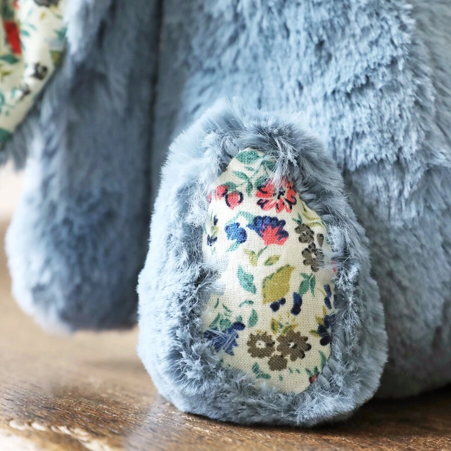 With super soft fur in dusky blue, blossom floral printed ears and a squishy tum, this sweet little bunny is a unique character, ready for snuggling.