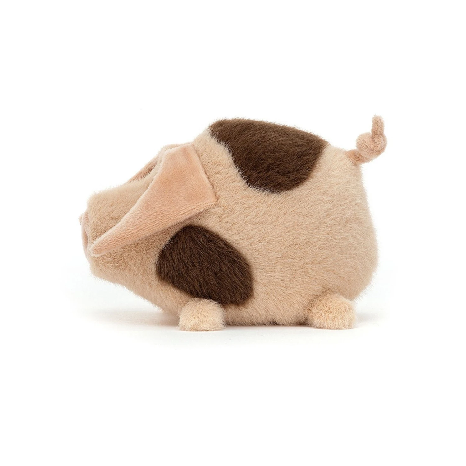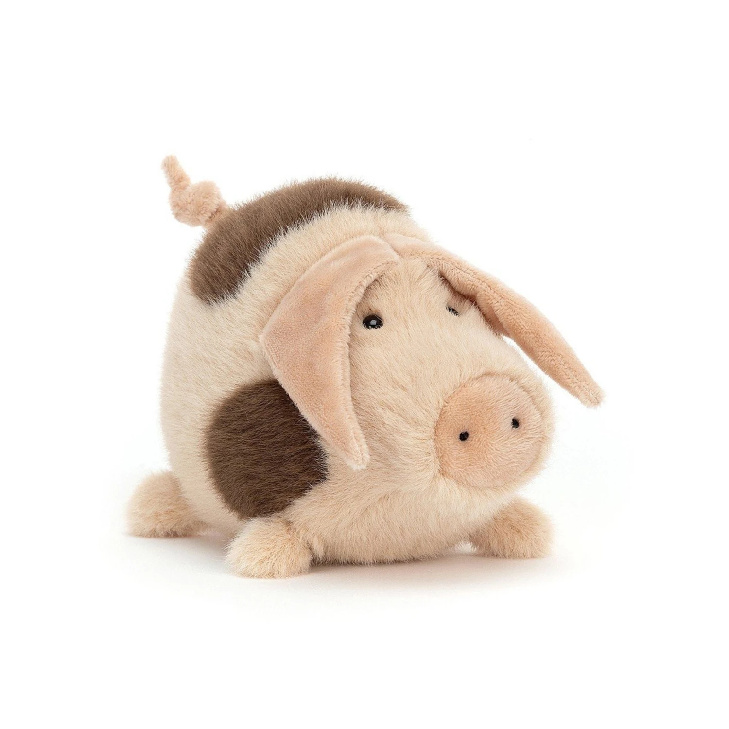 Higgledy Piggledy Old Spot is one curious pig! In sweet peachy pink with cocoa splotches, all a-totter on tiny trotters, this barnyard dandy snouts about everywhere. And what a fine, fuzzy snout it is! Just the handsome friend to take snuffling, rolling and rumbling!