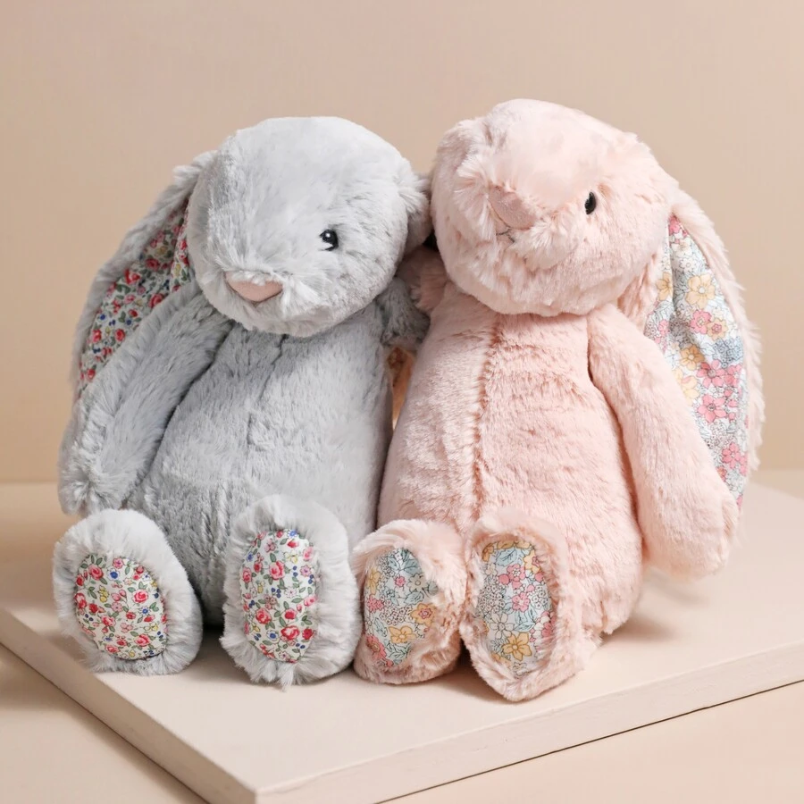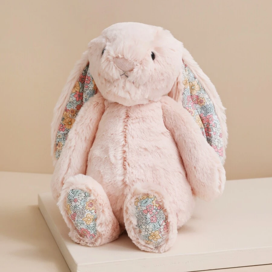 Blossom Blush Bunny from Jellycat is soft, squishy, and ultra snuggly. With silky pastel pink fur and long floppy ears, she makes the perfect sensory toy for little ones and animal lovers alike. Featuring a beautiful blossom print fabric on her feet and the underside of her ears, this pretty pal is ready for spring/summer celebrations.