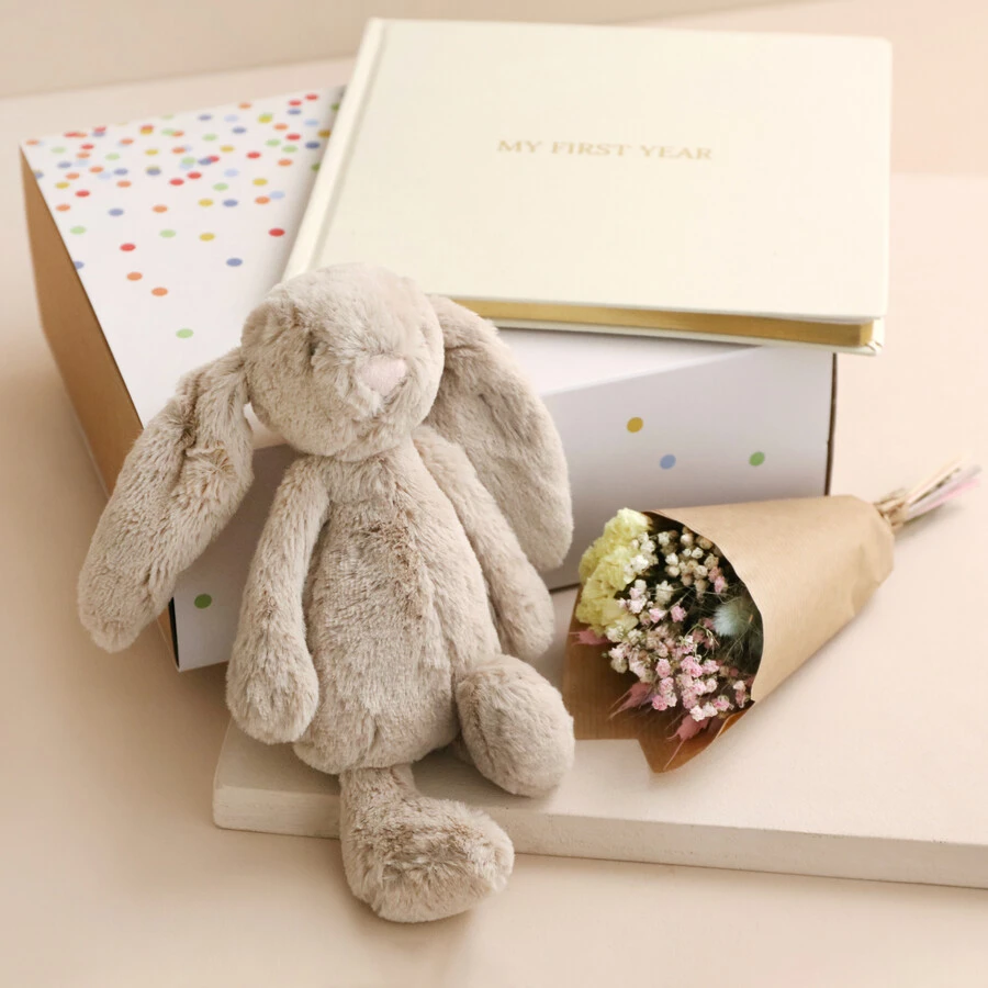 With a super sweet posy of dried flowers featuring bunny tails and pastel tones, hand-tied by our expert team and the softest, flop-eared Jellycat bashful bunny toy – this hamper is perfect for both mum and baby.